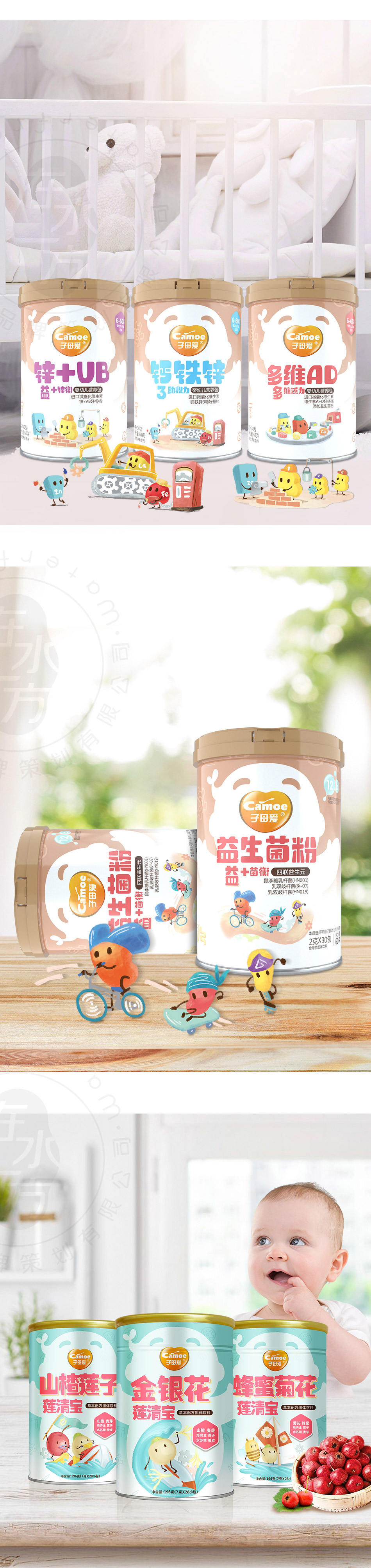 項目方案:子母愛品牌圍繞嬰童輔食營養(yǎng)品領域打造有情感有品質有親和力的品牌形象,迎合當前年輕消費市場的審美和體驗需求,用原創(chuàng)性手繪風格增加產(chǎn)品訴求力,提升陳列效果的同時也有助于品牌口碑和營銷的推進。