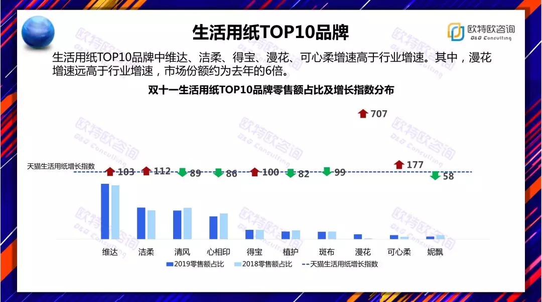 雙11已成為中國(guó)消費(fèi)市場(chǎng)的一個(gè)縮影,更是中國(guó)消費(fèi)趨勢(shì)的風(fēng)向標(biāo)。生活用紙方面,維達(dá)、潔柔、清風(fēng)占據(jù)前三甲,在TOP10中,維達(dá),潔柔、得寶、漫花、可心柔增速高于行業(yè)增速。那么下一個(gè)十年已經(jīng)開啟,誰(shuí)將領(lǐng)跑中國(guó)消費(fèi)市場(chǎng)呢?