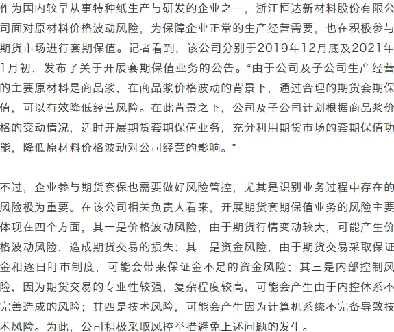 近期紙漿期貨價格已經(jīng)站穩(wěn)6000元/噸關口,不斷突破上市以來的新高。隨著原料價格波動的加大,紙廠套保需求顯著增加。面對困難的形勢,一些企業(yè)通過套保操作,不僅實現(xiàn)了業(yè)績穩(wěn)定,業(yè)務規(guī)模還逆勢增長。