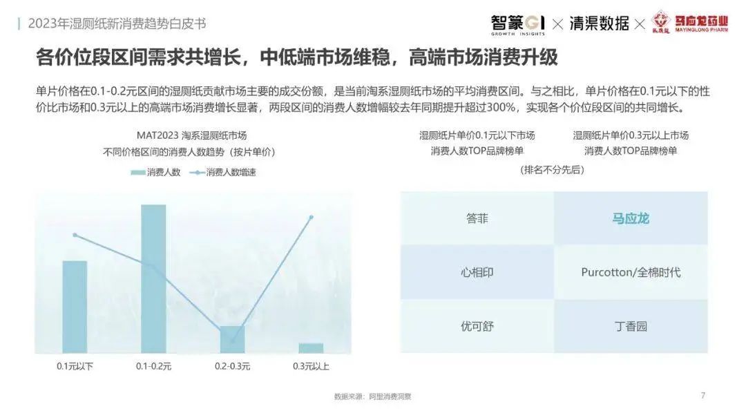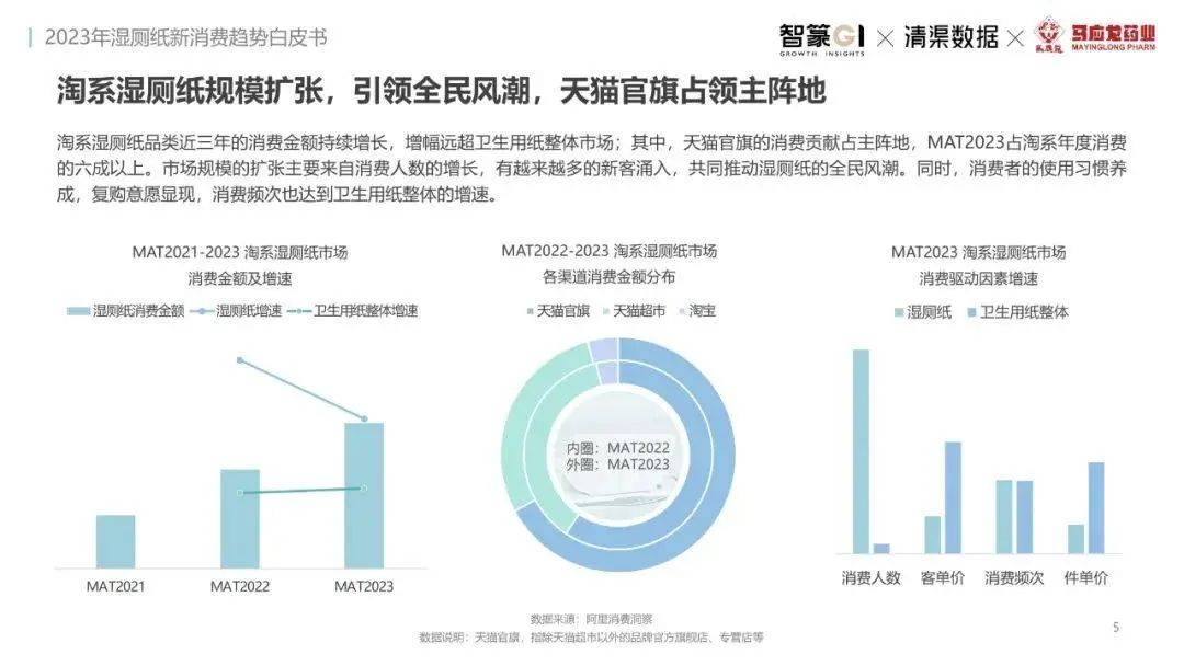 淘系濕廁紙品類近三年的消費(fèi)金額持續(xù)增長,增幅遠(yuǎn)超衛(wèi)生用紙整體市場,其中,天貓官旗的消費(fèi)責(zé)獻(xiàn)占主陣地,MAT2023占淘系年度消費(fèi)的六成以上,市場規(guī)模的擴(kuò)張主要來自消費(fèi)人數(shù)的增長,有越來越多的新客涌入,共同推動溫廁紙的全民風(fēng)潮,同時(shí),消費(fèi)者的使用習(xí)慣養(yǎng)成,復(fù)購意愿顯現(xiàn),消費(fèi)頻次也達(dá)到衛(wèi)生用紙整體的增速。