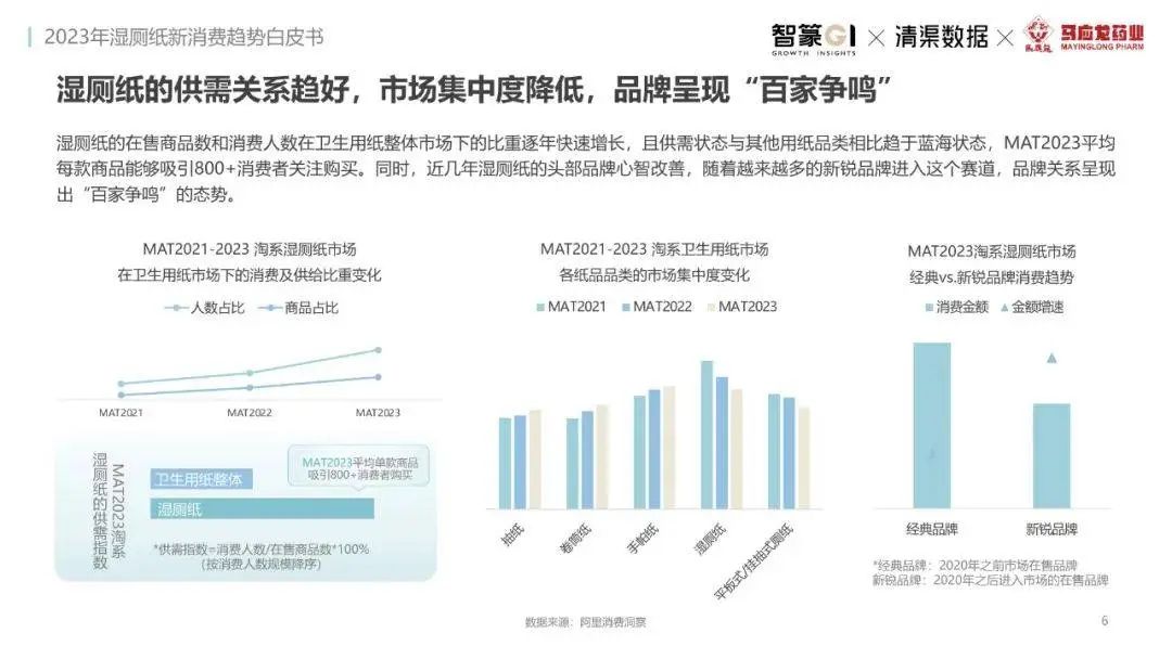 濕廁紙的在售商品數(shù)和消費(fèi)人數(shù)在衛(wèi)生用紙整體市場下的比重逐年快速增長,且供需狀態(tài)與其他用紙品類相比趨于藍(lán)海狀態(tài),MAT2023平均每款商品能夠吸引800+消費(fèi)者關(guān)注購買,同時(shí),近幾年濕廁紙的頭部品牌心智改善,隨著越來越多的新說品牌進(jìn)入這個(gè)賽道,品牌關(guān)系呈現(xiàn)出“百家爭鳴”的志勢。